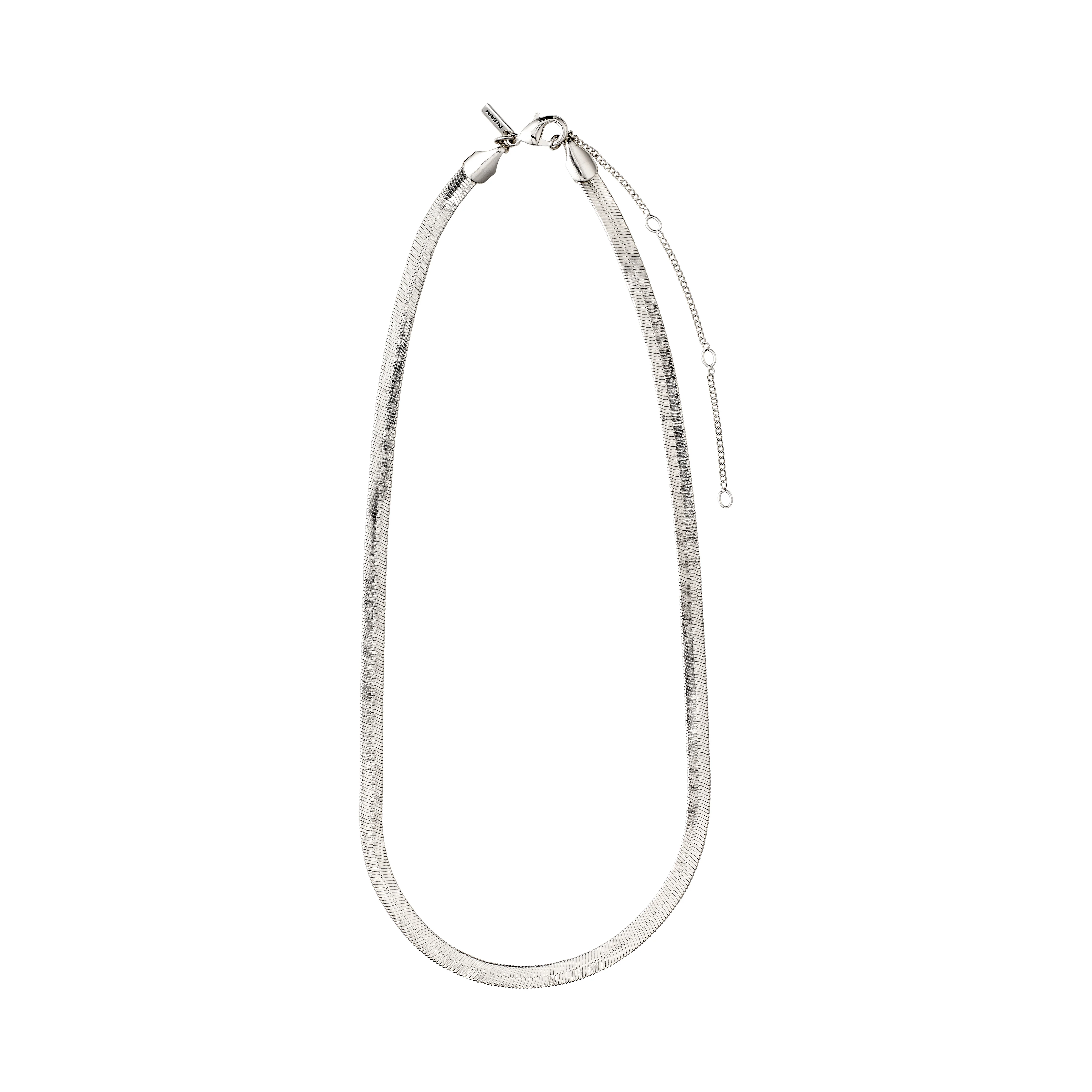 Polished silver-plated serpent necklace in a broad band with a stunning texture. The multiple flat links of the necklace create a fascinating pattern and lie beautifully around the neck. A stylish necklace with a distinctive and slightly exotic look. Beautiful on its own, but can also be layered with other Pilgrim necklaces.